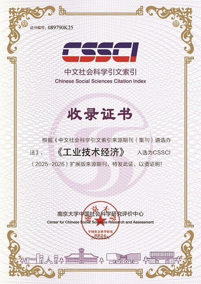 《工业技术经济》杂志是吉林省科学技术厅主管、吉林省科学技术信息研究所主办,面向全国公开发行的经济类科技期刊。《工业技术经济》杂志自1981年创刊以来,发表了许多具有社会影响力和较高水平的研究论文,及有理论价值和现实意义的研究课题成果,充分发挥了期刊的学术“窗口”作用。《工业技术经济》杂志是全国中文核心期刊(第10版)(即,北大核心2023年版),CSSCI(2025-2026)扩展版来源期刊,同时还是《中国人民大学书报复印资料》重要来源期刊;在《中国学术期刊影响因子年报(人文社会科学版)》经济与管理科学中的“F4工业经济专题”49个期刊中位列第2,进入Q1区,复合影响因子(2023版)为5.201,综合影响因子(2023版)为2.151。